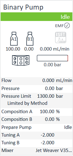 Tuning signal is positive (about +1.5 ), pressure signal is stable. | Wrong solvent is set in the CDS or wrong solvent is connected. |