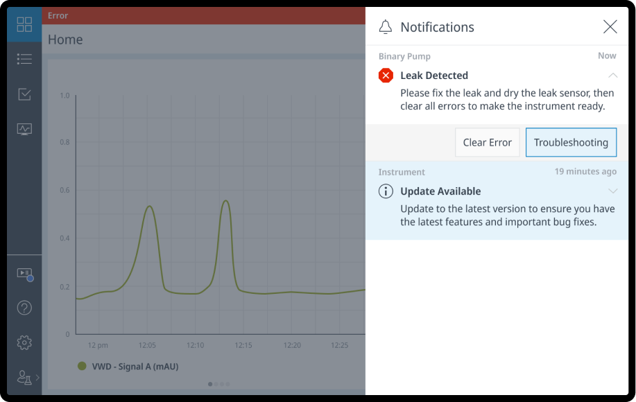 The Notifications panel collects system messages. The red dot indicates that new messages are available. Contextual actions like clearing errors are possible in place.