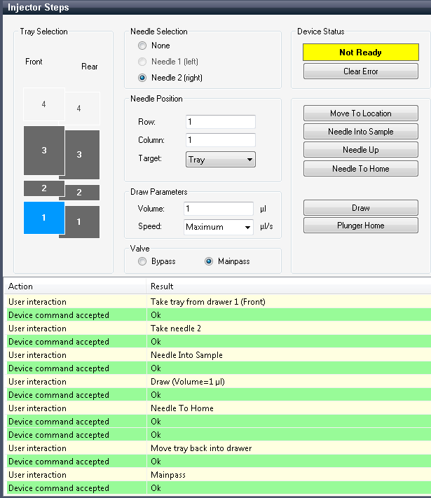 Each movement of the sampling sequence can be done under manual control. This is useful during troubleshooting, where close observation of each of the sampling steps is required to confirm a specific failure mode or verify successful completion of a repair. Each injector step command actually consists of a series of individual commands that move the multisampler components to predefined positions, enabling the specific step to be done.