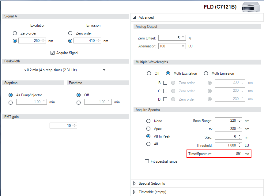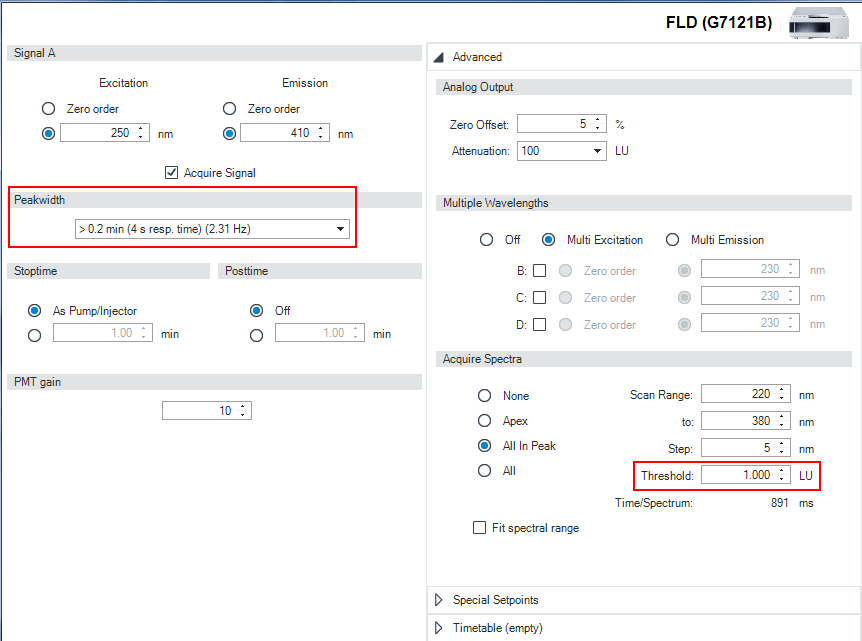 The peak triggered spectra acquisition in the FLD is controlled by two parameters - THRS (Threshold) and PDPW (PeakDetector PeakWidth). In addition the parameter PKWD (Detector PeakWidth) only influences the filtering of the chromatogram.