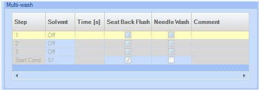 | Multi-wash (Multisampler Injection Cleaning) The Multi-wash table allows you to specify up to four steps that will be used to clean the system. The Start Cond. step is not always executed. Therefore it is recommend to check the box to ensure that, at the end of the cleaning procedure, the flow path of the sampler is filled with the starting solvent conditions for the next sample. For each cleaning step, Click the Solvent down arrow and select the solvent to use (S1, S2, S3) or switch the step Off. Specify a duration (in seconds) in the Time [s] field. Mark the check boxes for Seat Back Flush and/or Needle Wash to include these actions. If both are selected, they are carried out simultaneously; if neither is selected, the step is ignored (equivalent to selecting Off). Add a comment in the Comment column, if necessary.