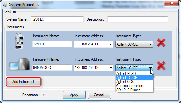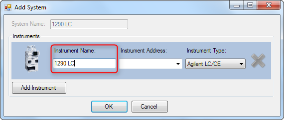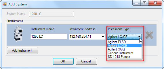 Click the Instrument Type down-arrow and select the type of instrument you are adding from the list. The default setting is Agilent LC/CE. Additional instrument types become available when the respective add-ons are installed.