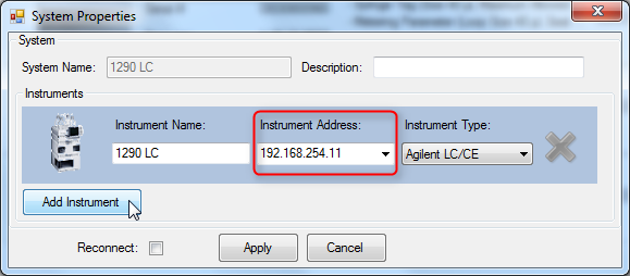 The Instrument Address can be an IP address, the host name or, if you are connecting using a serial cable, the COM port.
