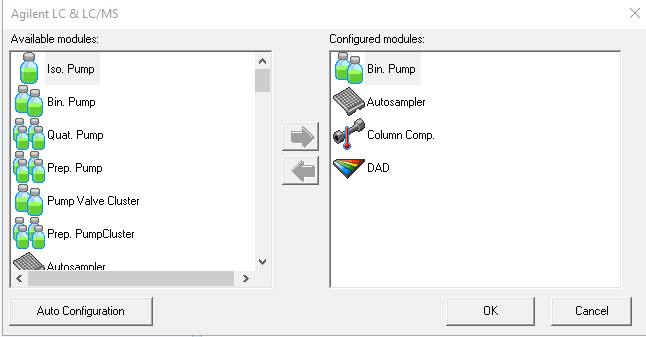 Click on the module that needs the latest solvent calibration table (ie G7120A). Then choose configure, launching the additional configuration of the pump module.