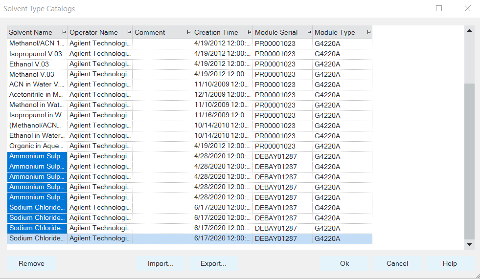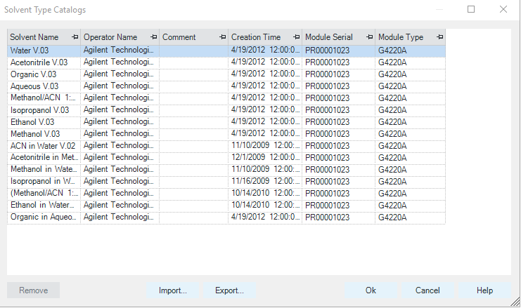 The imported solvent table will now appear in the Solvent Type Catalogs.