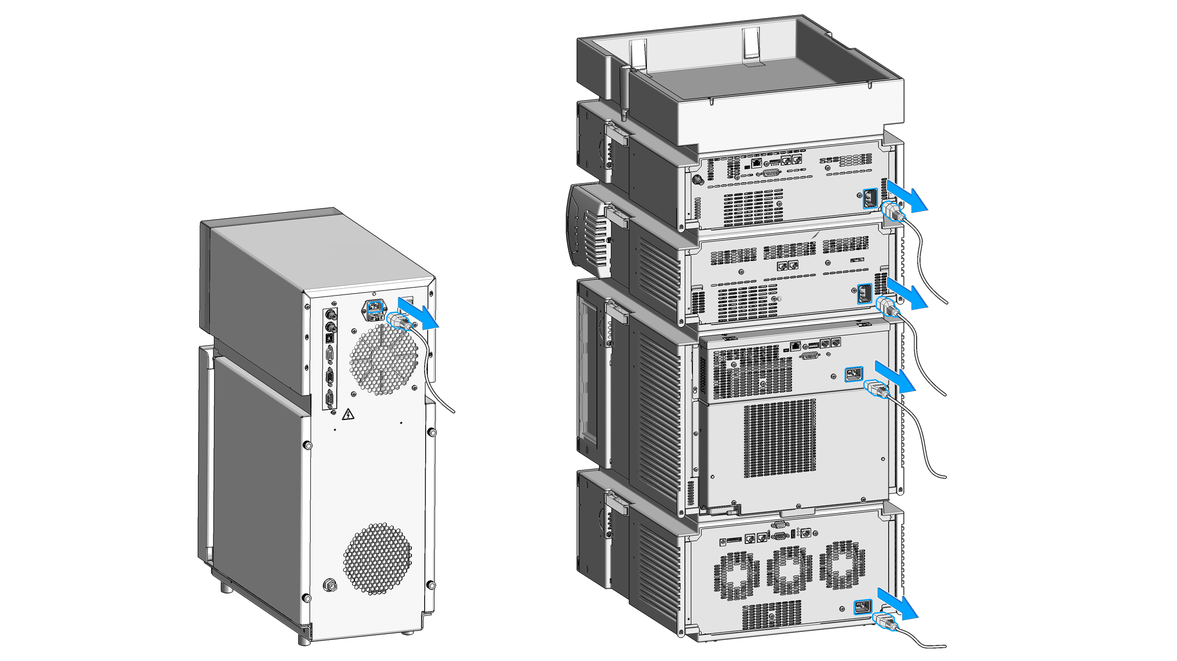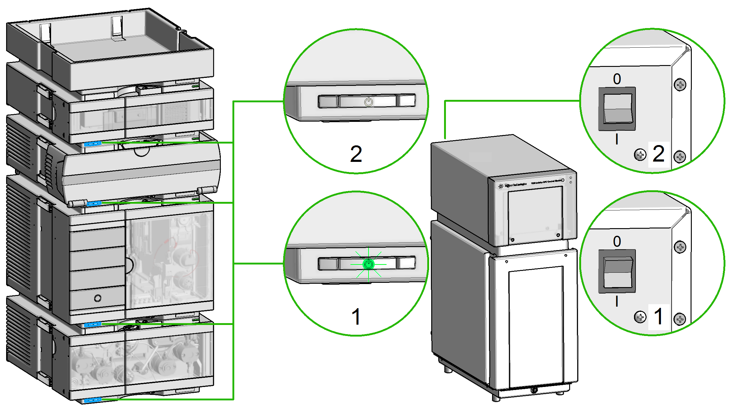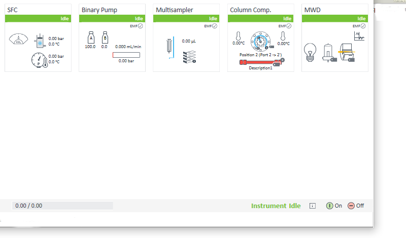 Turn on SFC Control Module first. Wait until temperatures are reached and booster pump starts pumping. 70 bar booster pressure is reached. Switch on binary pump flow.