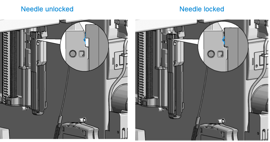 This procedure is completely different than the standard PM replacement of the needle assembly in Lab Advisor. The safety lock of the needle assembly has to be released by carefully sliding the pusher upwards.