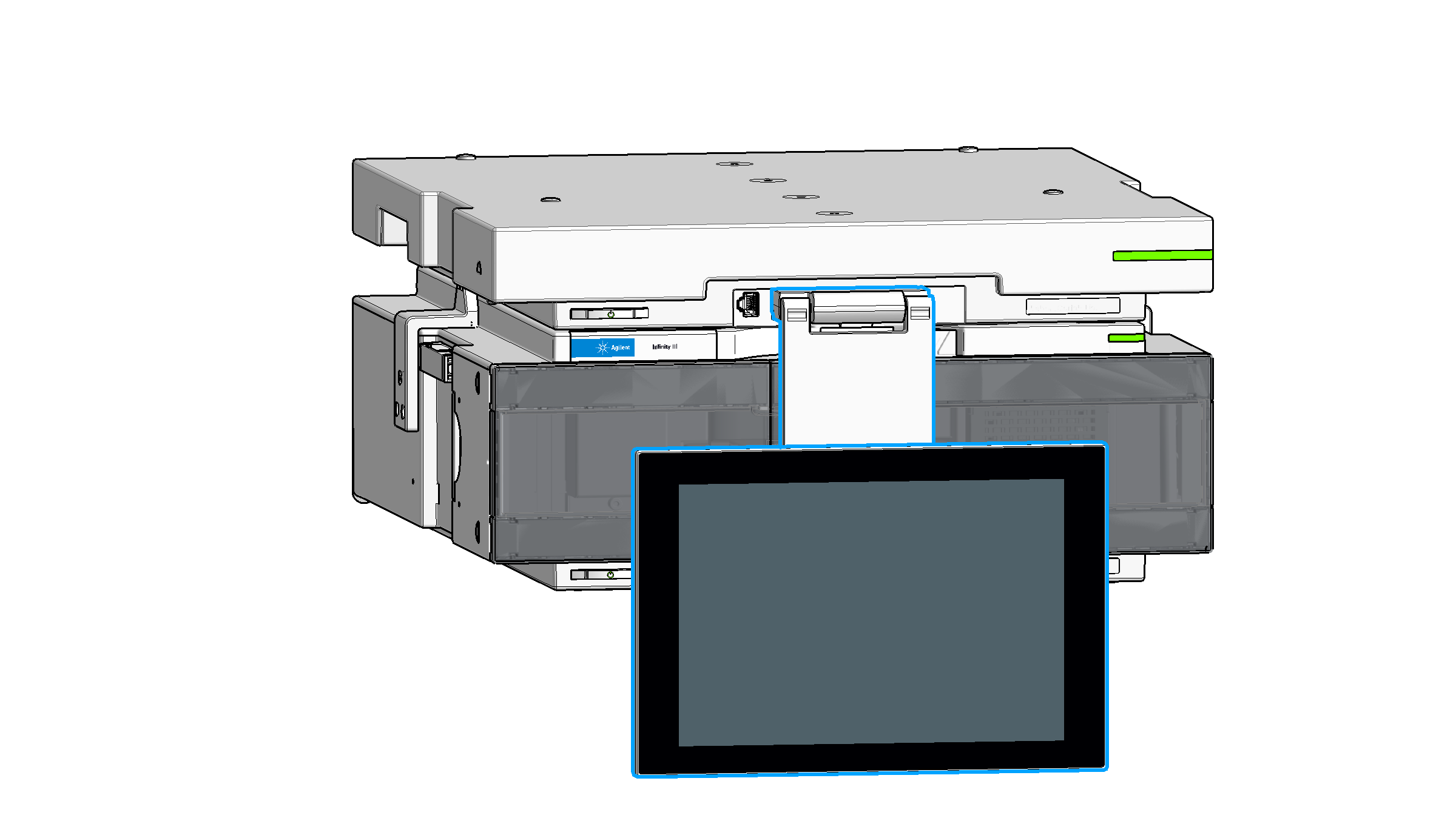 The InfinityLab Assist Hub and InfinityLab Assist Interface do not have any flow path. The concept of the Assist Interface with display arm is to create an ergonomic user interface for all users. The home position of the Assist Interface is in its highest position against the solvent cabinet or the InfinityLab Level Sensing module. The Assist Interface can be moved to a lower position to interact with users who have difficulty operating the user interface in the home position.