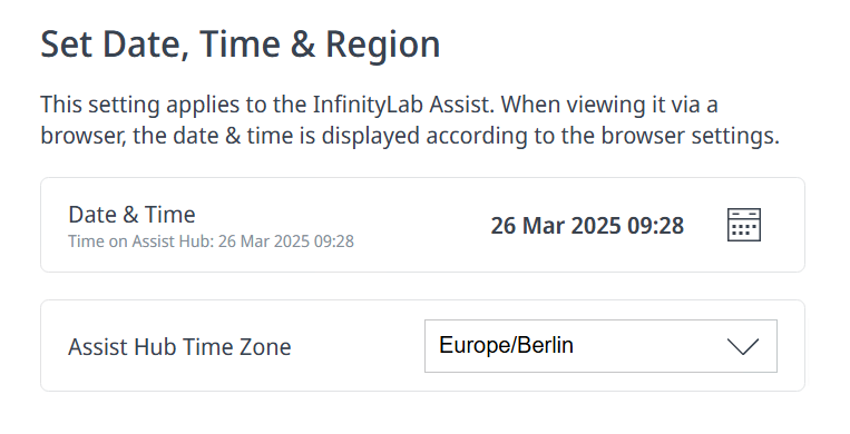 This setting applies to the InfinityLab Assist. If you started InfinityLab Assist remotely in a Web browser, the date and time are displayed according to the browser settings.