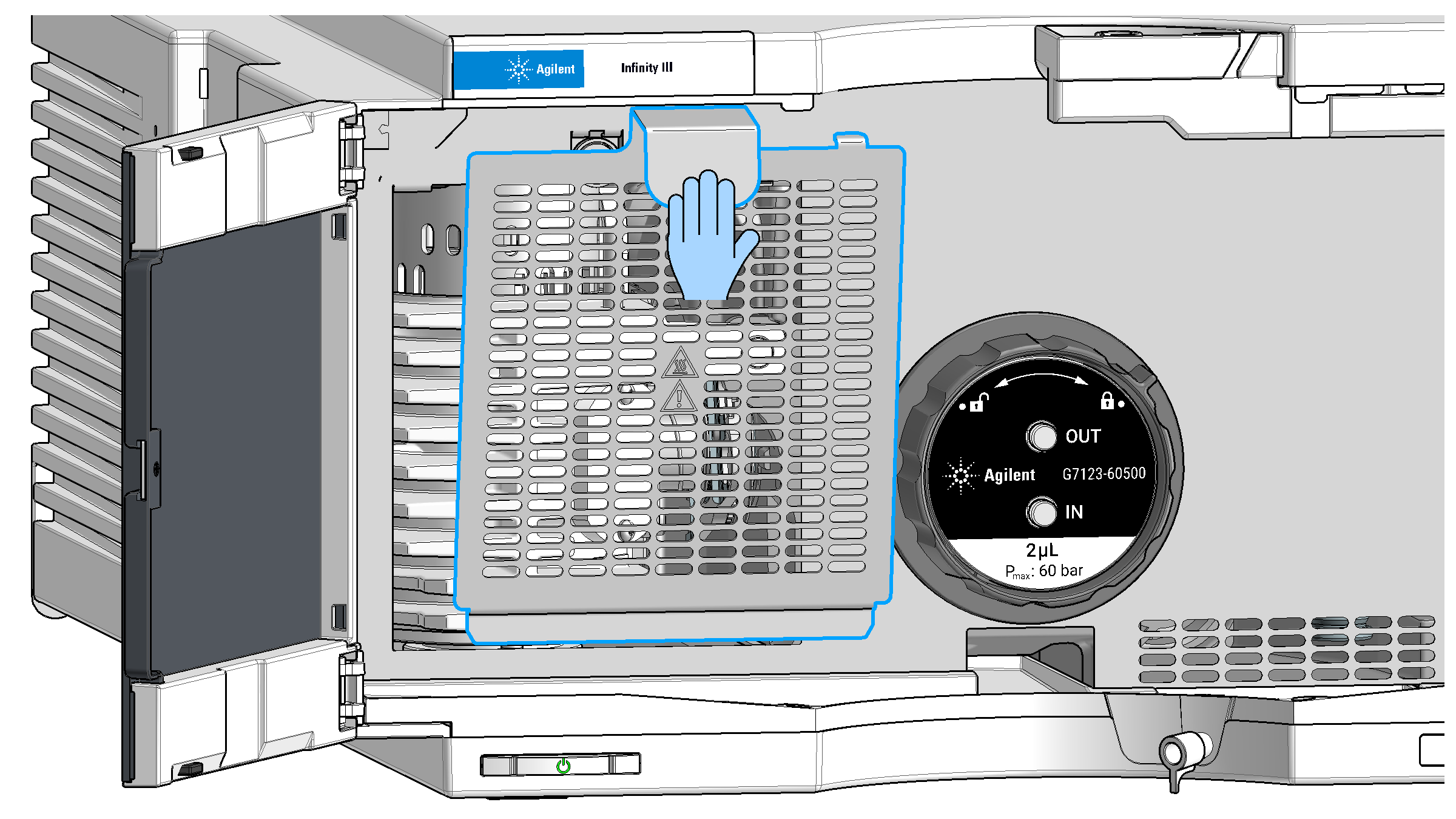 Re-install the safety grid. Insert at the bottom, then the top gets held in place by a magnet.