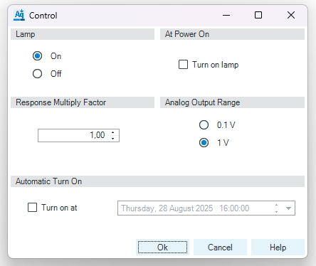 Lamp: can be turned ON/OFF. Response Multiply Factor: 1 Automatic Turn On: automatic detector power on. At Power On: automatic lamp-on at power on. Analog Output Range: can be set to either 100 mV or 1 V full scale, for additional settings see Analog Output (under Method Parameter Settings).