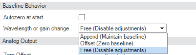 | Baseline Behavior Baseline behavior allows you to choose what happens to the baseline after a change in wavelength or PMT gain.