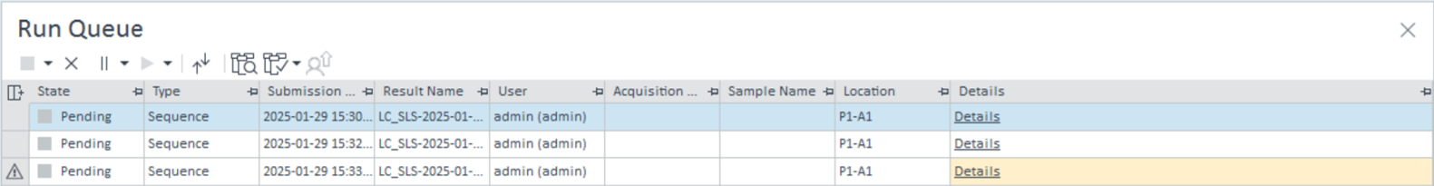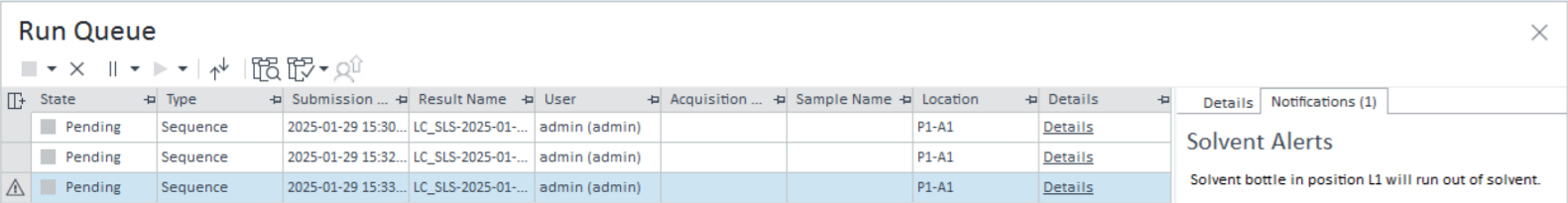 For single samples, the user submits the run to the Run Queue. In case the solvent level is not sufficient, there is a notification displayed on Run Queue level. The user is not prevented from submitting the run.