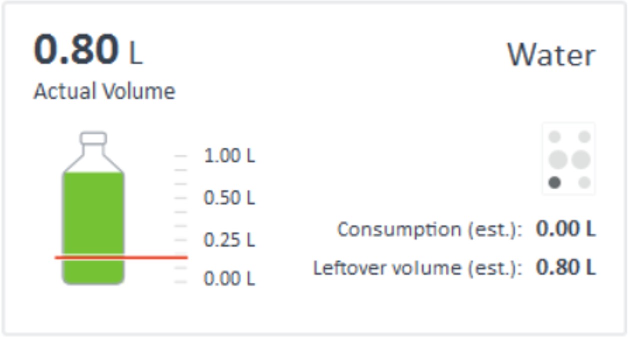 Remaining solvent level in the bottle shown as leftover volume after entire Run Queue is completed.