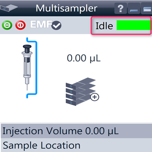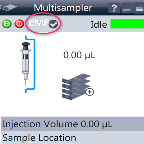 | Within the Multisampler user interface, there are active areas. If you move the mouse cursor across the icons (tray, EMF button), the cursor will change and you may click on the icon to
