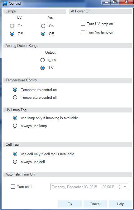Lamps: can be turned ON/OFF. At Power On: automatic lamp-on at power on. Analog Output Range: can be set to either 100 mV or 1 V full scale, for additional settings see Analog Output (under Method Parameter Settings). Temperature Control: can be turned ON/OFF. The optical unit is kept on constant temperature and improves the baseline stability in unstable environments. See also note below. ON it will keep the optical unit stabilized. UV Lamp Tag Use lamp only if lamp tag is available detects a lamp with RFID tag. If no RFID tag lamp is used, “UV lamp not ready” is displayed and it cannot be ignited. A compatible mode has to be selected based on the used lamp; see Non-RFID-tag lamp information below. Always use lamp: In case a non-RFID-tag lamp is used, the user interface will show this when selecting a compatible mode. You may operate the detector outside of the guaranteed specification. The correct selection is important for optimal performance and lifetime.