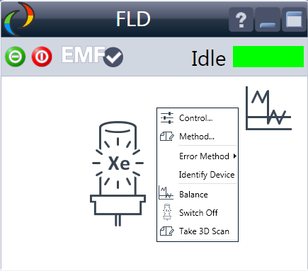 | A right-click into the Active Area will open a menu to Show the Control Interface (special module settings) Show the Method interface (similar as via menu Instrument > Setup Instrument Method ) Set Error Method Identify Module (Status LED will blink) Perform a Balance Switch the lamp on/off (same as click on button “Make Device Ready/Turn device off (standby)”)