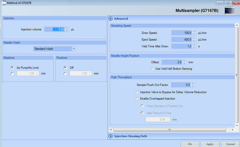 | Stoptime/Posttime A Multisampler Stoptime can be set. For equilibration of the Multisampler a Posttime can be set. |