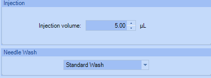 | Injection Mode/Needle Wash The settable Injection volume is depending on what kind of configuration is installed. Default configuration 0.1 – 20 µL. It is possible to select between using the Standard Wash or Standard Wash off. Using needle wash is one option to obtain minimum carryover.