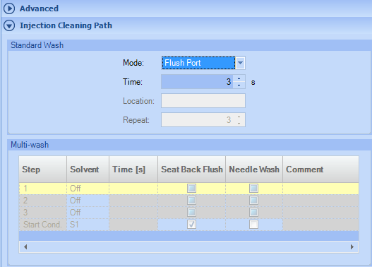 | Multi-wash (Multisampler Injection Cleaning) The Multi-wash table allows you to specify up to four steps that will be used to clean the system. The Start Cond. step is not always executed. Therefore it is recommend to check the box to ensure that, at the end of the cleaning procedure, the flow path of the sampler is filled with the starting solvent conditions for the next sample. For each cleaning step, Click the Solvent down arrow and select the solvent to use (S1, S2, S3) or switch the step Off. Specify a duration (in seconds) in the Time [s] field. Mark the check boxes for Seat Back Flush and/or Needle Wash to include these actions. If both are selected, they are carried out simultaneously; if neither is selected, the step is ignored (equivalent to selecting Off). Add a comment in the Comment column, if necessary.