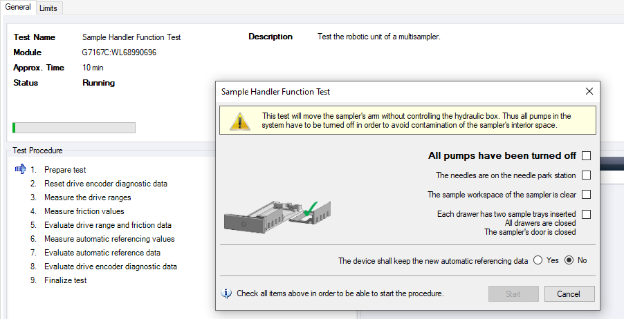 Run the Sample Handler Function Test with the Agilent Lab Advisor (for further information see Online-Help of user interface).