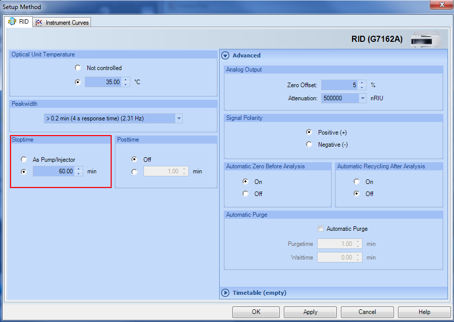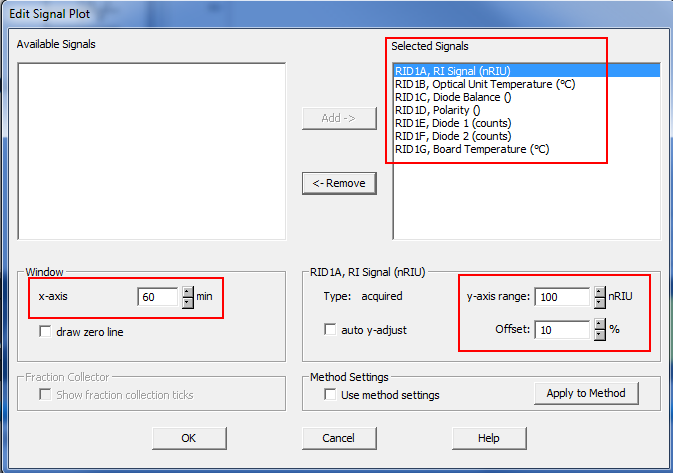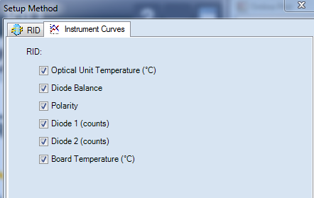 Under Instrument Curves you can select the available diagnostic signals. For baseline issue select the Optical Unit Temperature, Diode Balance, Diode 1 and Diode 2.