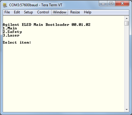 When in Service mode, the Tera Term displays the bootloader version and firmware menu.