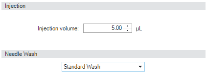 | Injection Mode/ Needle Wash The settable Injection volume is depending on what kind of configuration is installed. Default configuration 0.1 – 20 µL. It is possible to select between using the Standard Wash or Standard Wash off. Using needle wash is one option to obtain minimum carry-over. |