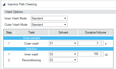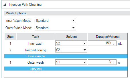 The Inner wash enables an additional wash step for the flow path. You can choose the solvent type, solvent volume, and duration of the step. The Outer wash is a wash step for the outer Needle surface in the Wash port. You can choose the solvent type, solvent volume, and duration of the step. The Seat wash is a wash step for the surface of the Needle Seat. You can choose the solvent type, solvent volume, and duration of the step. |