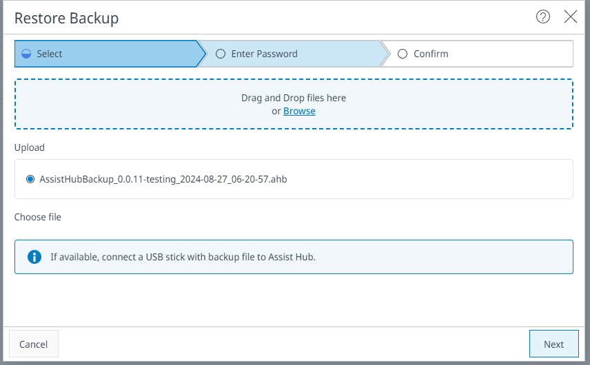 Either select the backup file on the USB or drag and drop the backup file into the field provided. Select Next to continue.