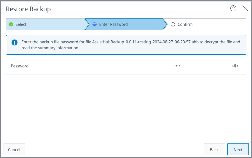 Enter the password that you set during the backup. Select Next to continue.