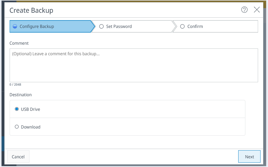 As Destination for the backup, select USB Drive or Download and enter a comment (optional). Select Next to continue.